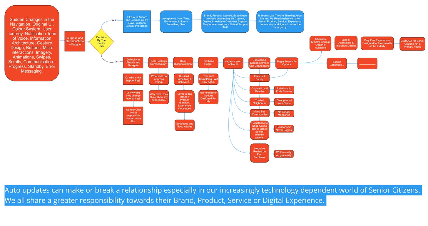 Tiniest of Sudden Changes in Navigation, Original UI, Colour System, Senior User Journeys, Notifications, Tone of Voice, Information Architecture, Gesture Design, Buttons, Microinteractions, Imagery, Menus, Animations, Swipes, Scrolls, Communication - Progress, Standby, Error Messaging can make or break a relationship especially in our increasingly technology dependent world of Senior Citizens. We all share a greater responsibility towards their journey with our Brand, Product, Service or the most complex or basic Digital Experiences.